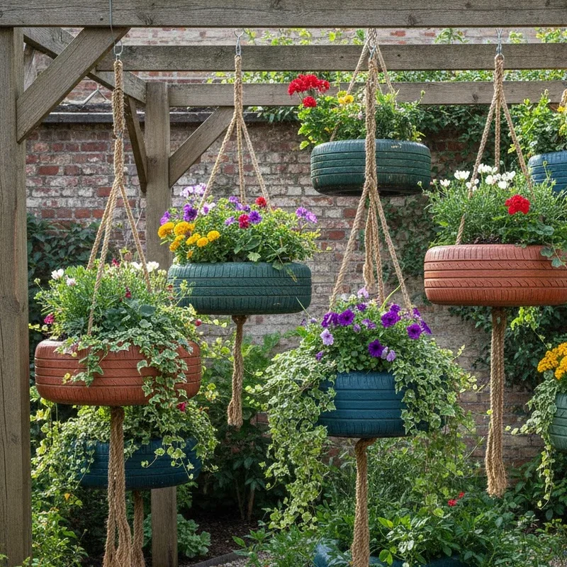 Remember the joy of tire swings from childhood? Now imagine combining that nostalgia with beautiful cascading flowers! Tire swing planters serve double duty as functional garden art and conversation starters. Hang a tire horizontally from a sturdy tree branch or pergola beam using heavy-duty rope or chains, ensuring proper drainage holes are drilled in the bottom. Fill with lightweight potting mix and plant trailing varieties like bacopa, lobelia, or sweet potato vine that'll create a living curtain of color. The gentle swaying motion in the breeze adds movement to your garden, while the elevated position keeps plants safe from rabbits and other garden nibblers. Kids love watching these magical floating gardens grow!