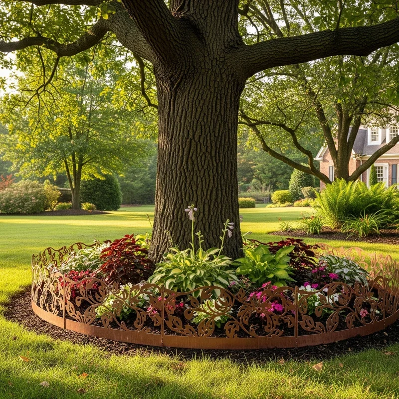 Add contemporary flair with decorative metal edging that creates clean, modern lines around your trees! Steel, aluminum, or powder-coated options provide durability and style that lasts for decades. Choose from various heights and decorative patterns like scalloped edges, Victorian designs, or minimalist straight lines. The thin profile means less disruption to roots while creating strong barriers against grass invasion. Metal edging bends easily to accommodate irregular tree shapes or create perfect circles. Corten steel develops a beautiful rust patina that adds character over time. Install with stakes for stability and connect sections seamlessly for professional results. This low-maintenance option works especially well in contemporary landscapes or when you want crisp definition. Your metal border becomes a sleek frame that modernizes traditional trees while requiring virtually no upkeep.