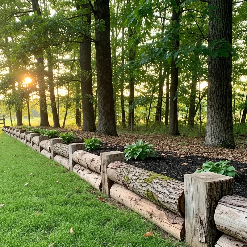Channel woodland charm with a rustic log border that brings cabin-style coziness to your garden! Use uniform log sections placed vertically or horizontally to create natural-looking edges around trees. Cedar, pine, or other rot-resistant woods work best for longevity in ground contact. Vary log heights for visual interest or keep them uniform for a neater appearance. The gaps between logs provide excellent drainage while the wood slowly decomposes, enriching surrounding soil. Treat logs with eco-friendly preservatives to extend their life or embrace the natural weathering process. This border style perfect for woodland gardens or rustic landscape themes. Stack logs Lincoln-log style for raised borders that double as casual seating. Your log border becomes a connection to nature that makes trees feel at home in their forest-inspired setting.