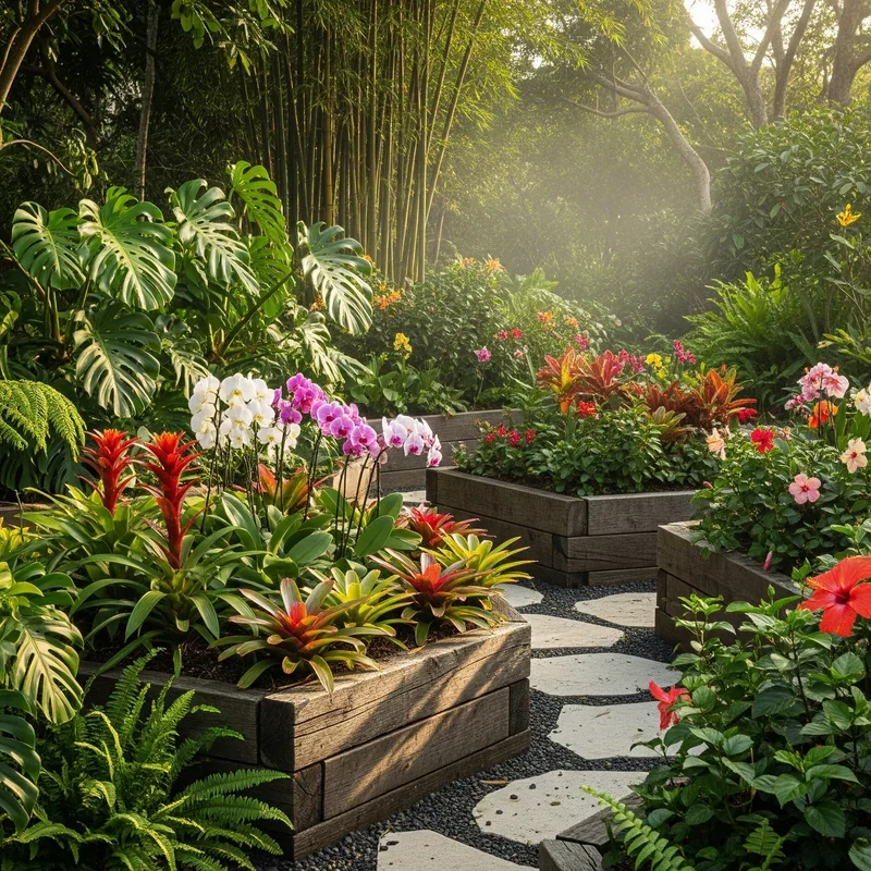 Elevate your tropical plants literally and figuratively with raised beds that improve drainage and create visual interest. These structured elements organize paradise beautifully! Build using natural materials like stone, timber, or bamboo that complement the tropical theme. The improved drainage is crucial for many tropical plants that hate wet feet despite loving humidity. Raised beds make maintenance easier, reducing bending and providing better access for pruning and care. Create different heights for dynamic visual layers that guide eyes through the garden. Fill with rich, well-draining soil amended with compost for explosive tropical growth. Use raised beds to define spaces, creating rooms within your paradise. The contained nature prevents aggressive tropical spreaders from taking over. Your raised beds become architectural features that add structure to tropical abundance.