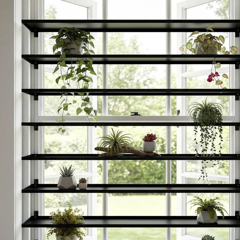 Multi-level staggered shelf arrangements create visual rhythm through asymmetrical placement that guides eyes across your entire window display. The varied heights prevent monotony while ensuring each plant receives adequate light without being overshadowed by neighbors. This dynamic approach transforms windows into living art installations that change with plant growth and seasonal rotations naturally. You can mix different shelf materials, depths, and styles to create eclectic arrangements that reflect your personality perfectly. The staggered design accommodates plants with different light requirements by positioning them at appropriate distances from glass. This arrangement style works universally across all interior design aesthetics, from minimalist to maximalist approaches seamlessly throughout your home.