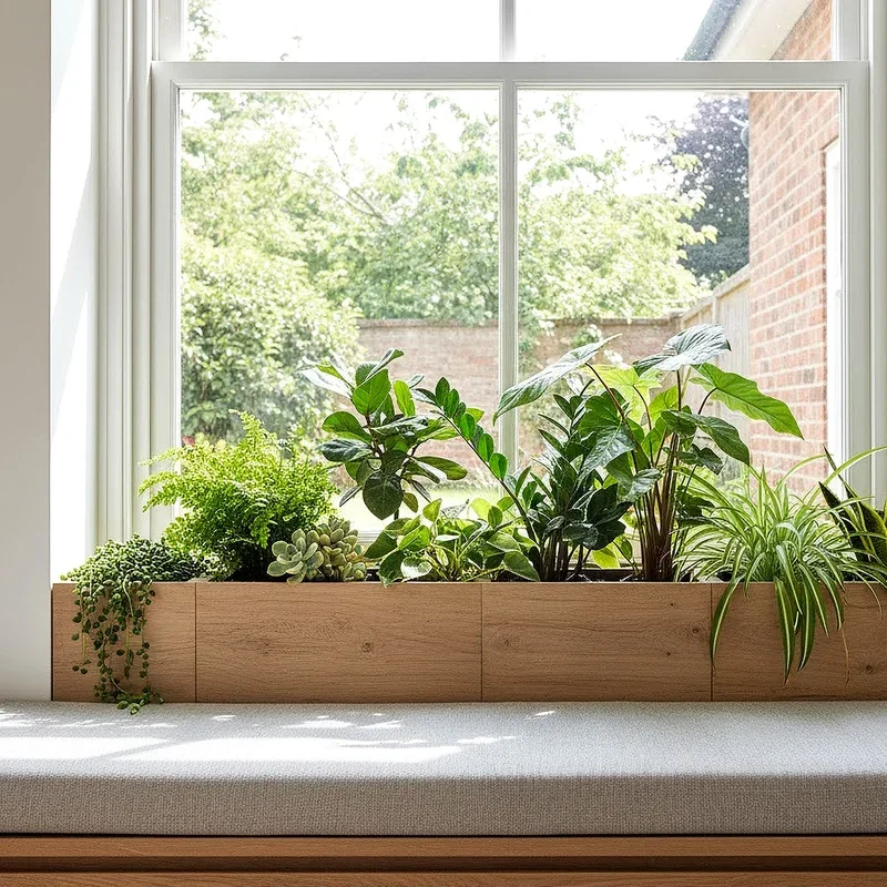 Built-in window seat planters combine comfortable seating with lush greenery, creating multifunctional spaces that maximize your window area beautifully. The integrated design allows you to incorporate planter boxes directly into the seat structure, surrounding yourself with nature. This permanent installation adds significant value to your home while creating a cozy nook perfect for reading or relaxation. You can design the seat to include storage underneath, hiding away gardening supplies or seasonal decorations conveniently. The built-in approach ensures perfect proportions that complement your window dimensions and architectural style seamlessly. Plants positioned at seat level create an intimate connection with nature that feels nurturing and restorative daily throughout the year.
