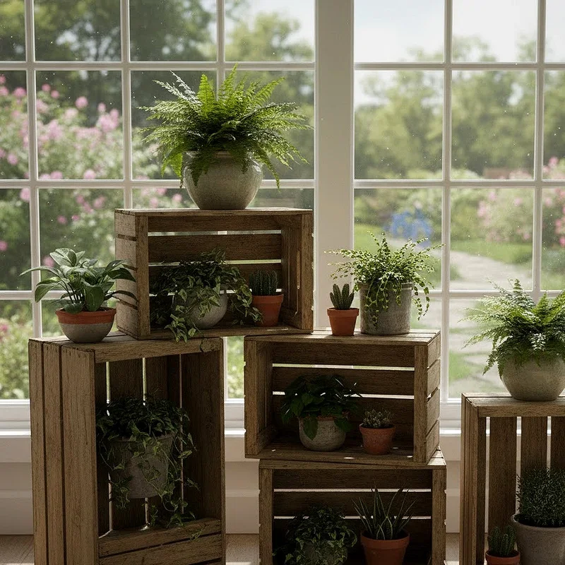 Vintage crate window displays repurpose weathered wooden boxes into charming plant shelves brimming with rustic character and history. The distressed wood adds instant personality that brand-new materials simply cannot replicate, no matter how carefully crafted. Each crate tells a story through its worn surfaces, stamps, and patina that develops over decades of use. You can stack crates in various configurations, creating custom arrangements that fit your specific window dimensions perfectly. The open construction allows air circulation around plants while providing multiple display levels within a compact footprint. Vintage crates work beautifully in farmhouse, shabby chic, or eclectic interiors where collected, curated looks shine brightest throughout the entire space.