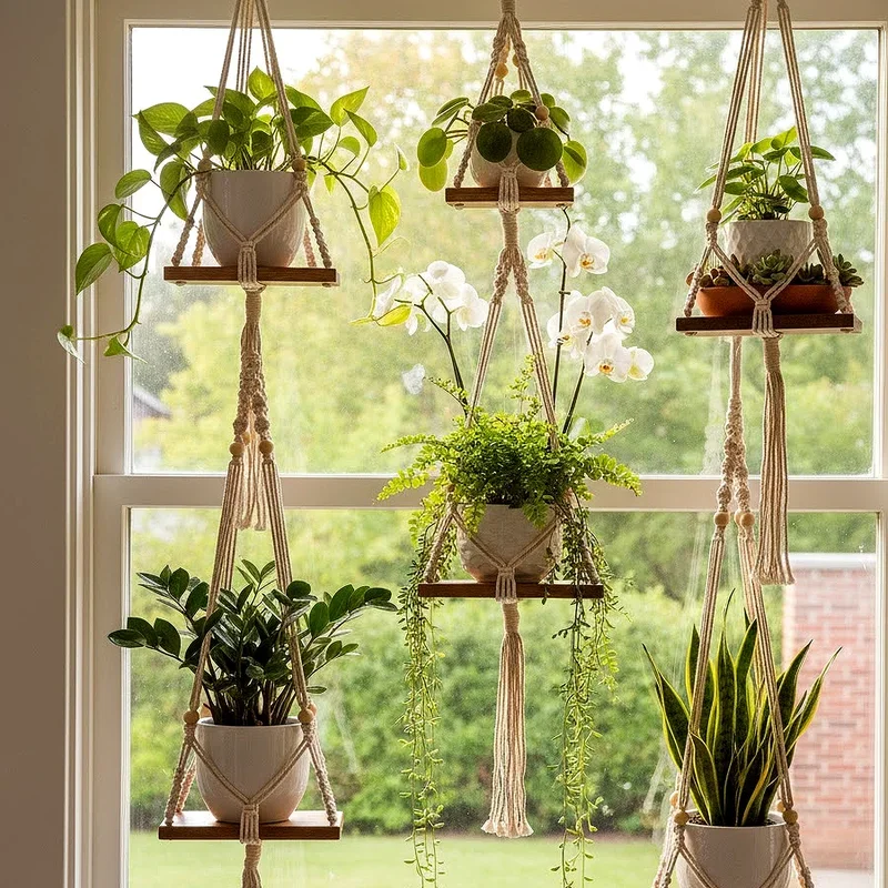 Hanging macrame shelf combinations blend bohemian artistry with practical functionality, creating textured layers that add character to your window display. The woven rope or cord designs provide a soft, organic contrast to hard surfaces while supporting your plant collection securely. You can hang multiple macrame shelves at staggered heights to create dynamic, flowing arrangements that catch the eye beautifully. The handcrafted quality brings artisanal charm that mass-produced shelving simply cannot replicate in your home. Macrame designs range from simple to intricate, allowing you to match your personal style perfectly. These hanging shelves work wonderfully for trailing plants like string of pearls or pothos that cascade through the woven patterns beautifully.
