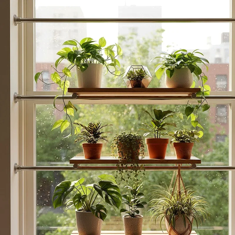 Adjustable track shelving systems mount vertically beside windows, offering infinite positioning possibilities that adapt to your changing plant needs. The movable brackets slide along metal tracks, allowing you to reconfigure shelf heights as plants grow or seasons shift. This flexibility proves invaluable for serious plant collectors whose arrangements evolve constantly throughout the year's progression. The sturdy construction supports substantial weight, accommodating large ceramic pots or multiple plants on single shelves confidently. Track systems create clean, organized displays that look intentional rather than haphazard or cluttered in appearance. You can easily add or remove shelves as your collection expands, making this a future-proof investment for passionate plant parents everywhere.
