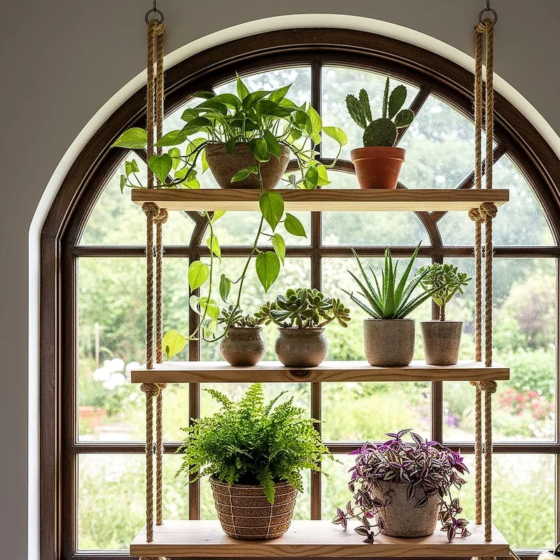 Rope and wood suspended shelves dangle from ceiling hooks or window frames, creating a nautical or rustic vibe that charms visitors. The natural materials work harmoniously together, with thick rope providing sturdy support while wooden planks offer stable platforms. This hanging design keeps floor space completely clear, making it perfect for smaller rooms where every square foot counts significantly. The slight movement adds gentle dynamism to your plant display, creating a living, breathing quality that static shelves cannot achieve. You can adjust rope lengths to position shelves at optimal heights for different plant varieties and their sunlight requirements. The handcrafted appearance brings artisanal quality that makes your window garden feel intentional and thoughtfully curated.