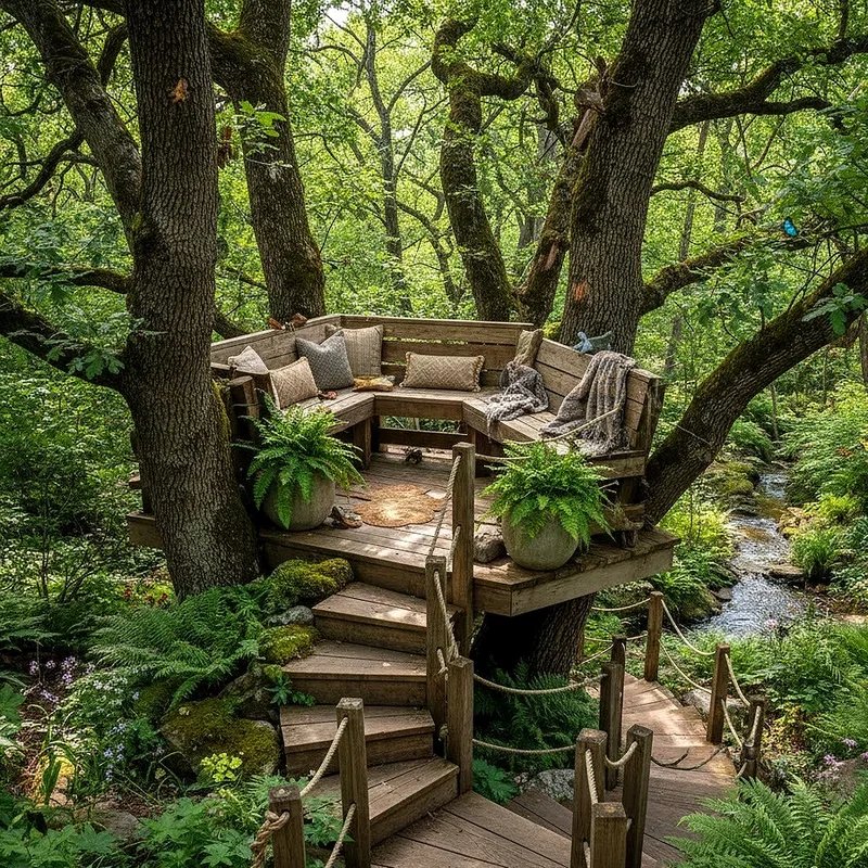 Your woodland garden should invite you to pause, sit, and immerse yourself in the forest atmosphere you have created. Design intimate seating areas nestled within the canopy where you can enjoy the sights, sounds, and scents of your personal woodland retreat. Use natural materials like rustic wooden benches, stone seats, or even simple log rounds that blend seamlessly into the forest aesthetic. Position seating to take advantage of particularly beautiful views or pleasant microclimates within your garden. These rest stops transform your woodland garden from something merely observed into an experience fully inhabited. Add a small side table for morning coffee or evening wine, creating an outdoor room that feels sheltered and peaceful.